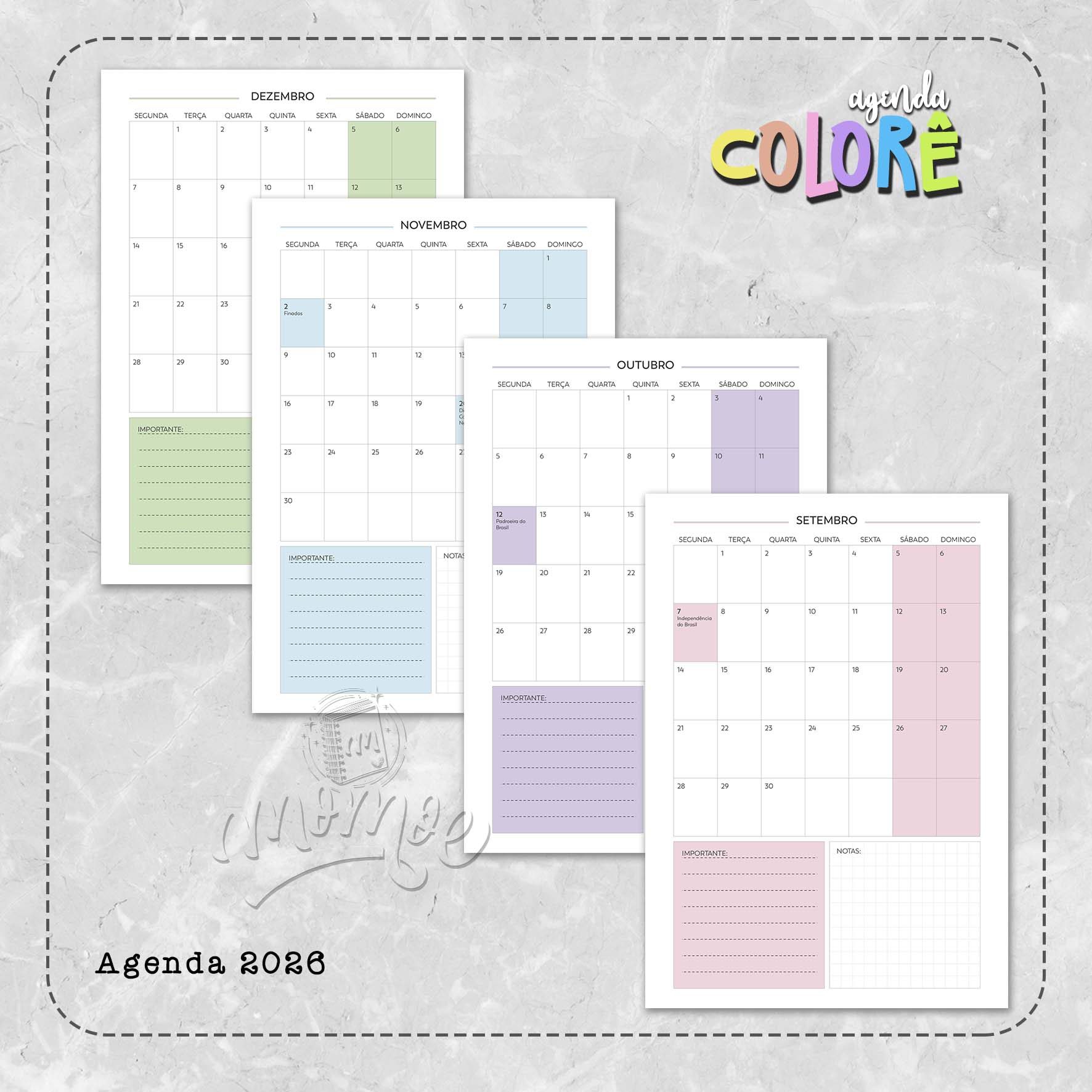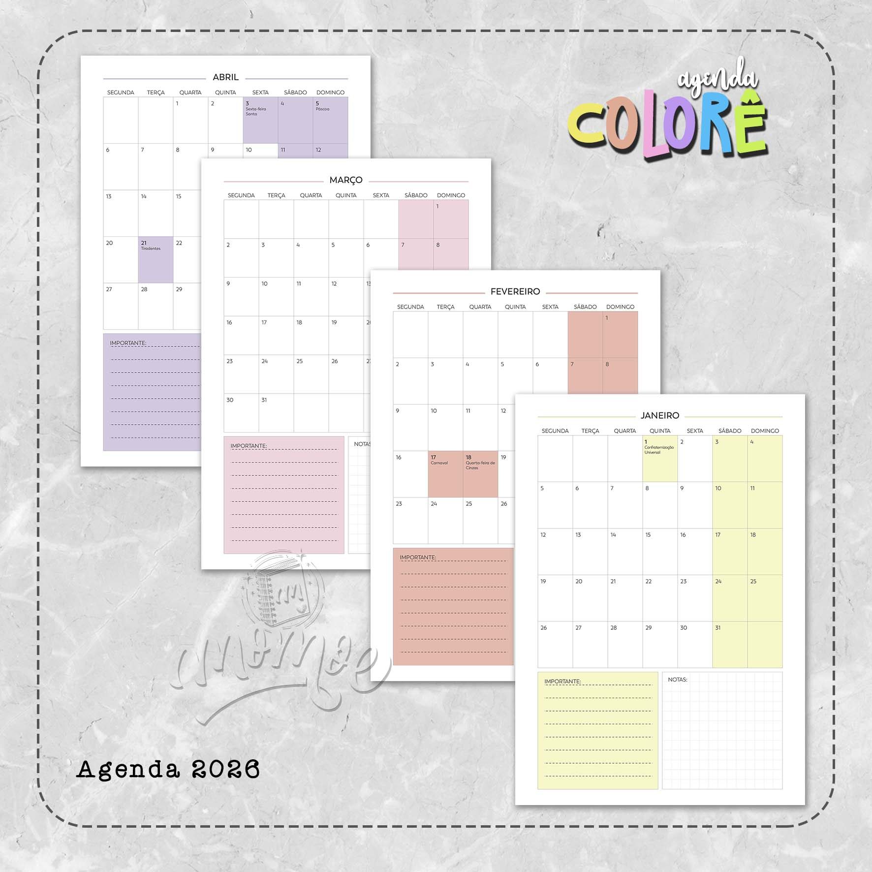 * Planejamento Mensal do mês ( todo mês com uma cor diferente – 6 cores no total)
