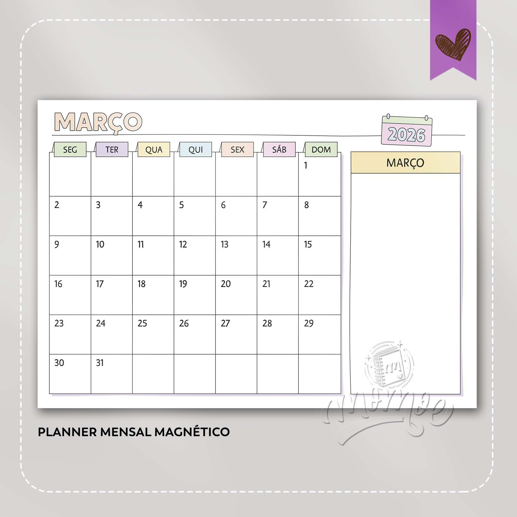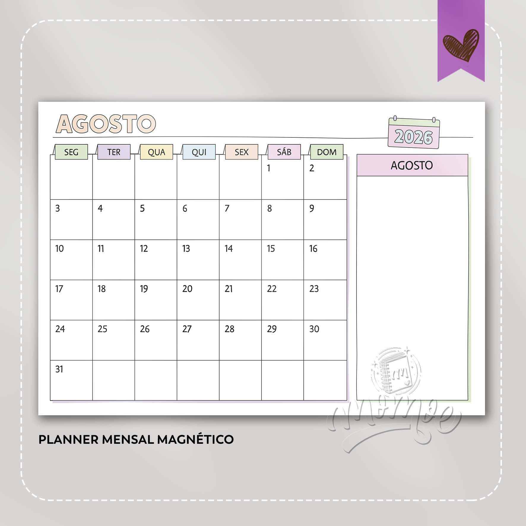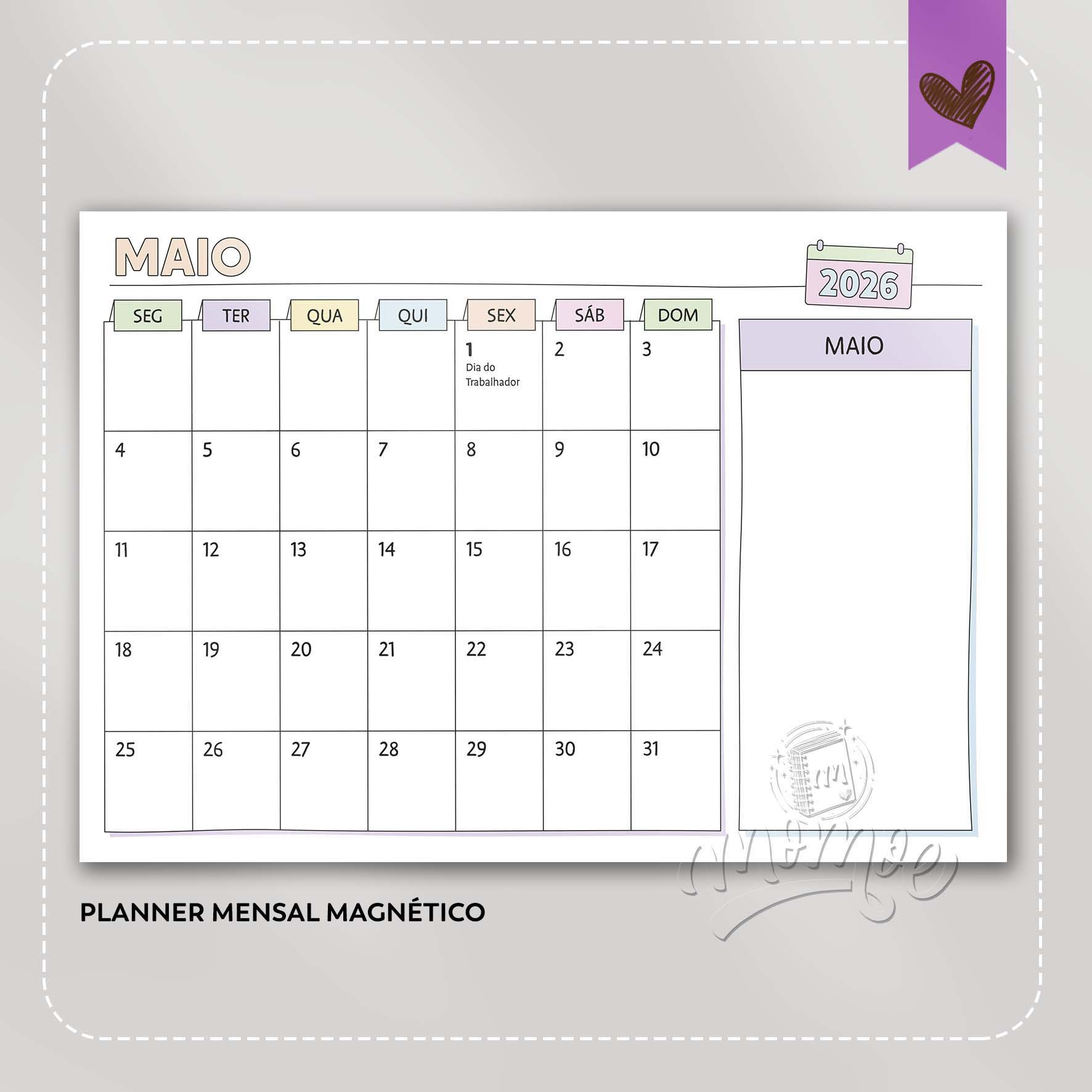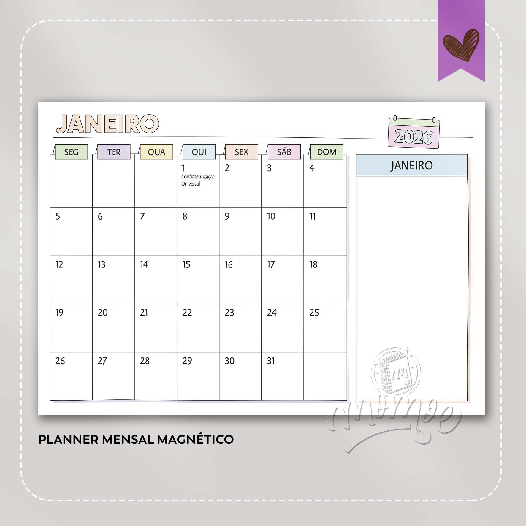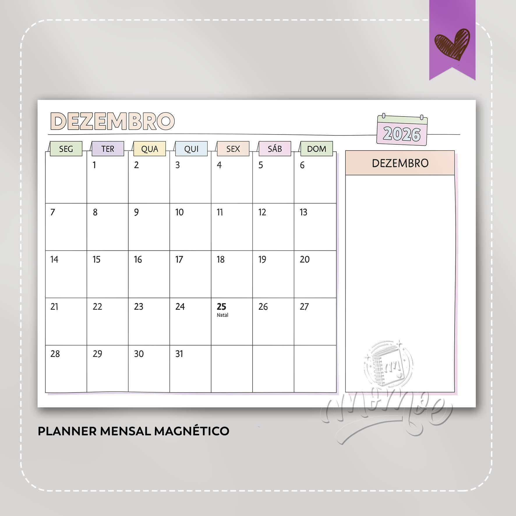 Planner Blocado Mensal Magnético – Calendário de geladeira 2026